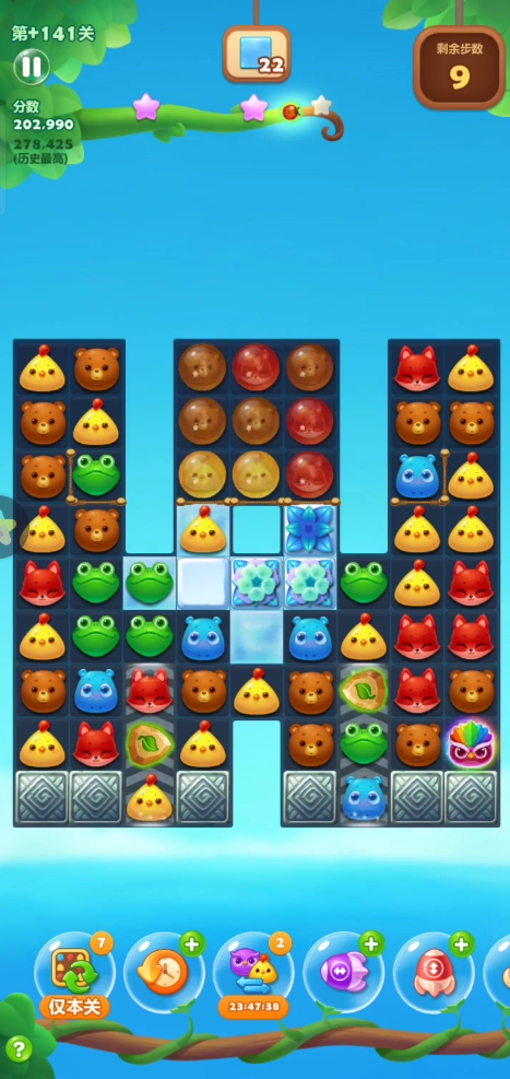每一步操作前都要观察动物掉落后的新布局,预判并创造下一步的有利条件。当两个特效相邻时,不要急着单独使用,思考互换是否能触发更大范围的连锁反应。在最后阶段如果步数紧张或遇到角落难消的冰块,可以尝试制造横向或竖向的直线特效进行针对性处理。