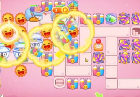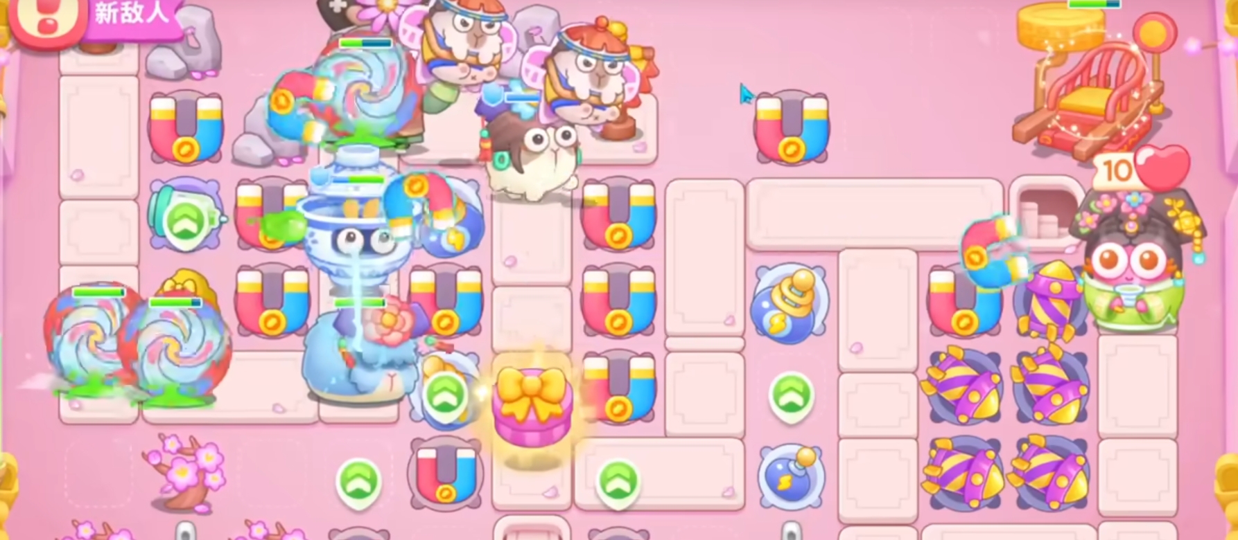 中期要注意游泳兔子的出现,只要在道路交叉口提前放好冷冻炮台,再加上新放置的武器,就能轻松挡住它们。第五波会出现冷冻兔子,这时候得在兔子出现的洞口放风扇炮台,并在前方补上弓箭炮台,把冷冻兔子控制在右侧区域。因为击败冷冻兔子会冻住附近的武器,所以咱们的策略是放弃右侧三格,直接在中心位置放鱼雷,这样既能输出又不会被冻住影响防御。